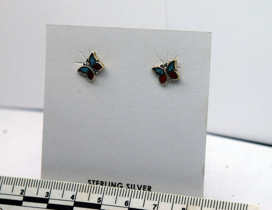 Butterfly Earrings Sterling Silver Stud Earrings 10 mm wide with Turquoise and Imitation Coral inlays